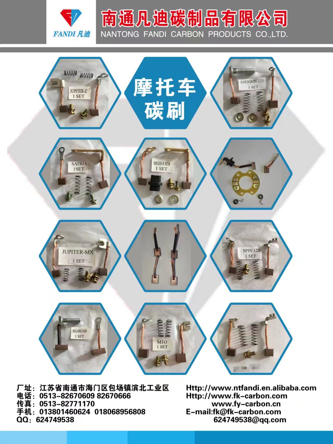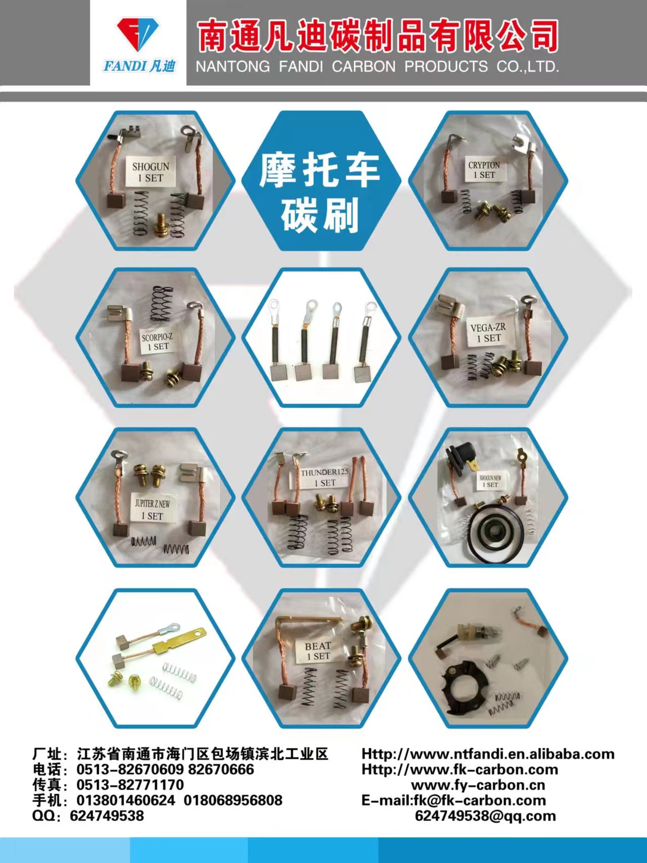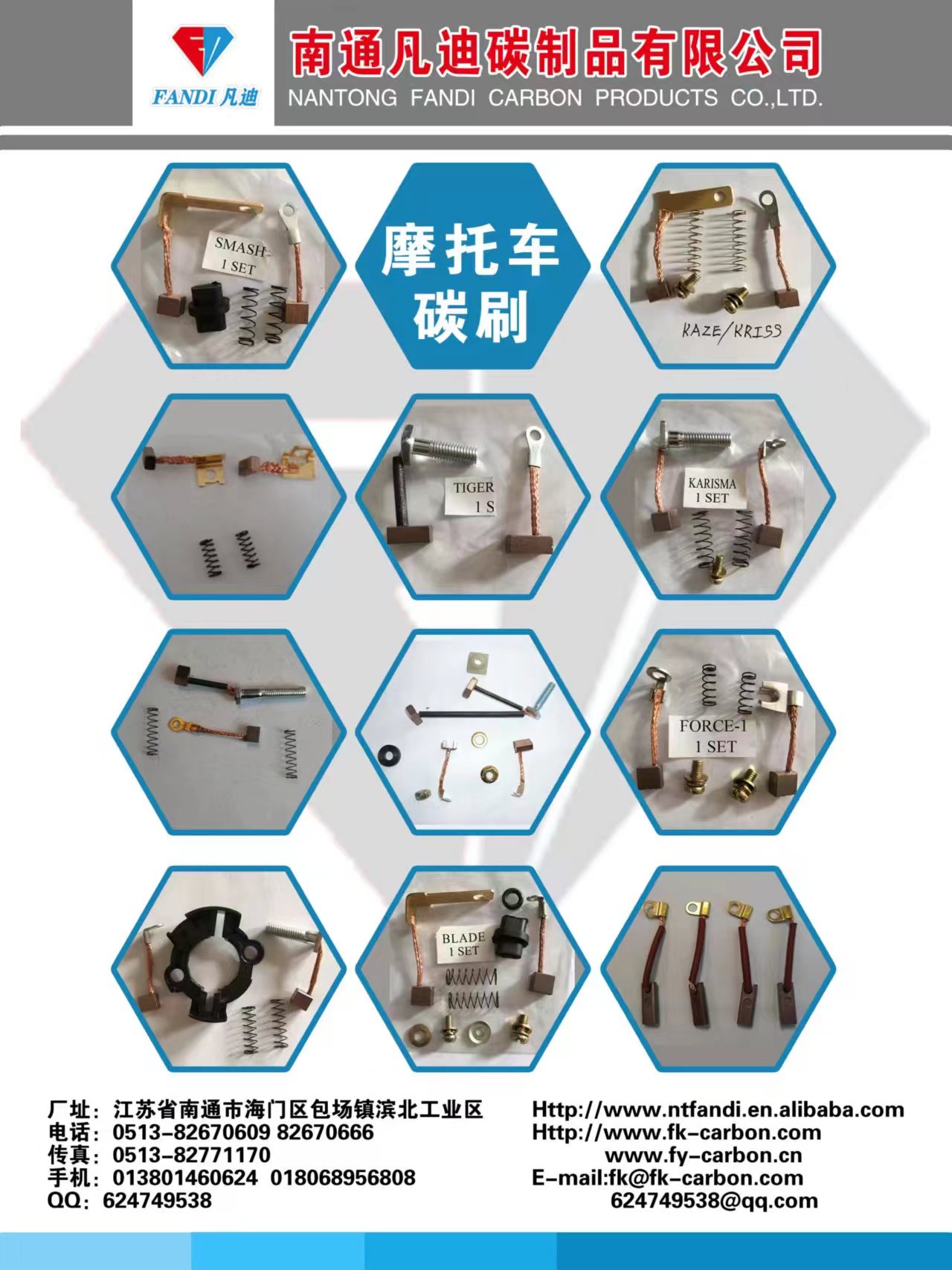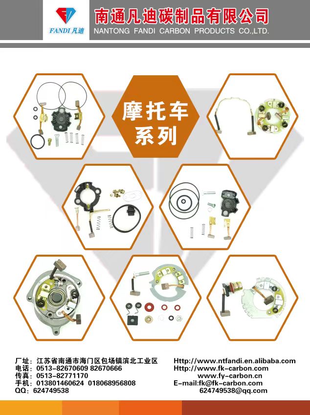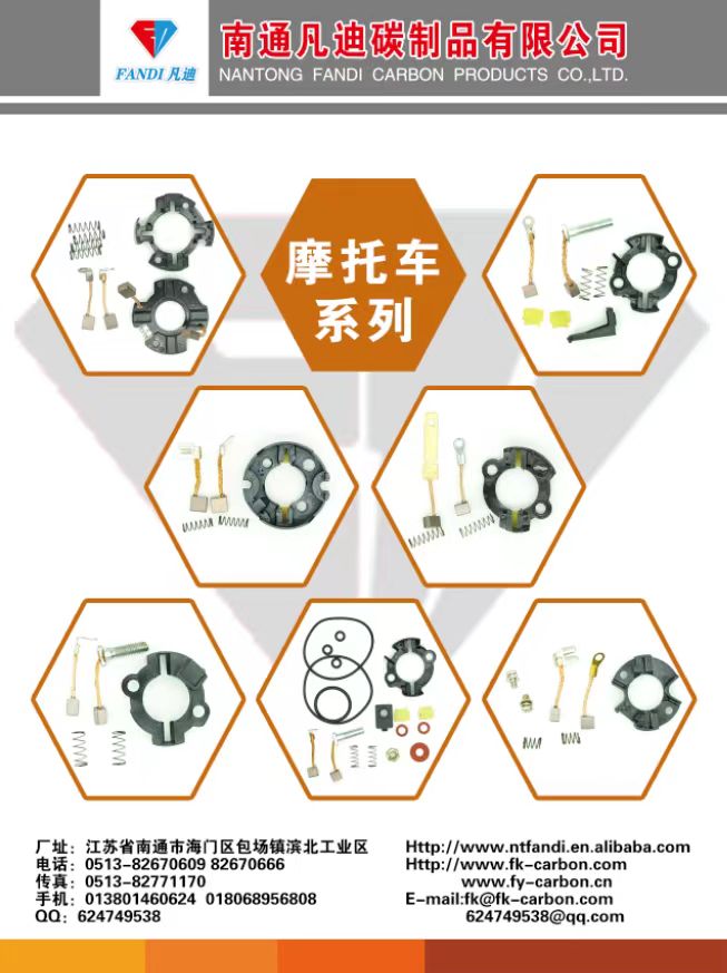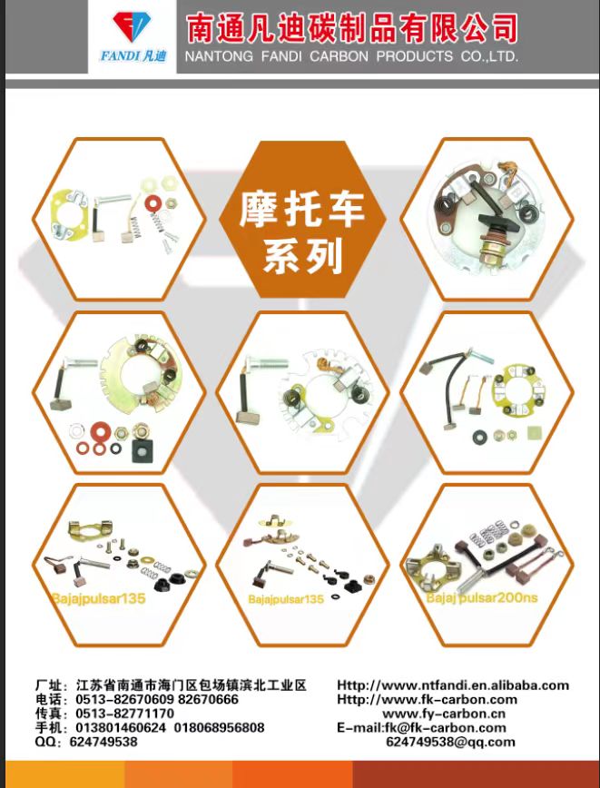Nantong Fandi Carbon Products Co., Ltd. produces various automotive and motorcycle motor brushes and brush holders, which are exported to more than 10 countries and regions in South America, the Middle East, Africa, Southeast Asia, Europe and America. The quality is excellent and the price is beautiful. Contact person: Mr. Tao +86 13801460624